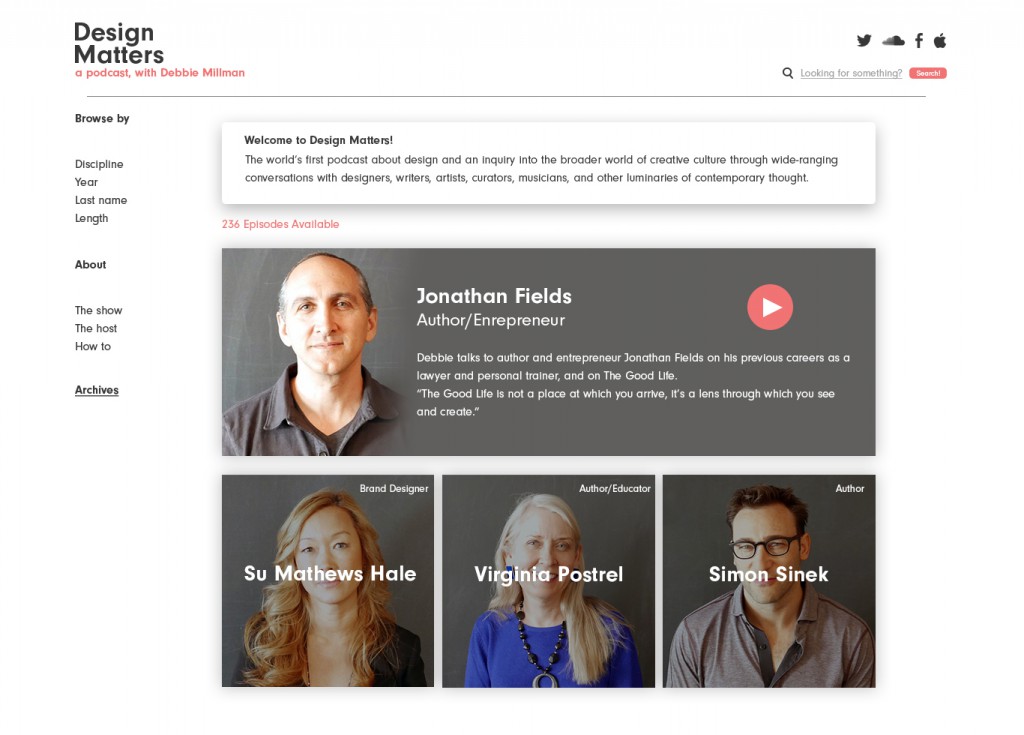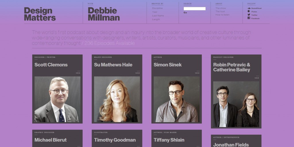 While I’m at the office I often have a design podcast running in the background. One of the podcast sites I visit most is Design Matters with Debbie Millman, so I decided to make a redesign concept in my spare time.