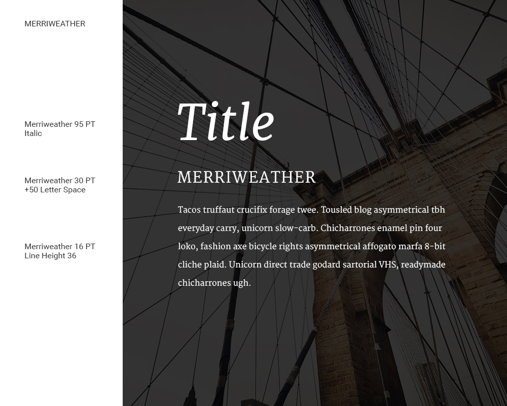 Using Google Fonts, we have created a few examples of using one font. By using different font sizes, weights, spacing and line height, we think we were able to establish a solid look for each of the three examples. We used some free images from Unsplash to help establish the tone for each example. Remember, all of these fonts can be downloaded for free using Google Fonts.