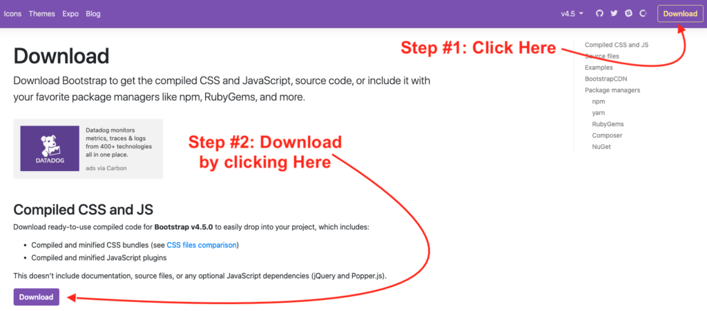 Now that we have your Underscores.me theme added and activated, its time to download and add our Bootstrap files! Go to getBootstrap.com click on the “Download” button located at the top right of the page, then download the files under the section titles “Compiled CSS and JS”.