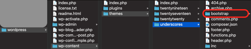 Open the downloaded .zip file “bootstrap-{version #}-dist.zip”, and rename the extracted folder to “bootstrap”. placed the newly renamed folder inside of your newly added underscores theme folder. This will be located: WordPress (Root Folder) -> wp-content (folder) -> themes (folder) -> {underscores theme name} (folder) – place the “bootstrap” (folder) here.