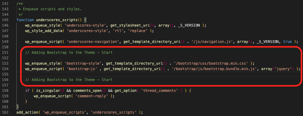 Now that Bootstrap is located inside of your Underscore.me Theme, its time to hook them together. Open your function.php file located in your Underscores.me Theme folder. Add the following code in the to the style enqueuing function located around line:145